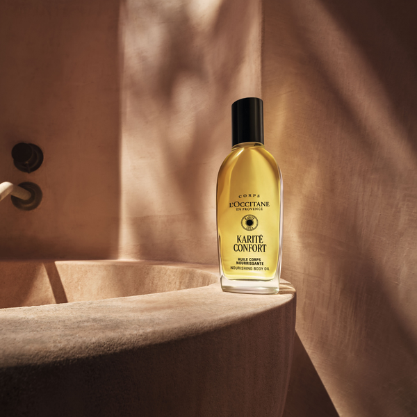 Enriquecido con 5% de aceite de karité, el Aceite Nutritivo de Cuerpo Karité es la fórmula ideal para nutrir, suavizar y ayudar a proteger la piel de la sequedad. Gracias a su textura rica y sedosa y su acabado satinado, se absorbe rápidamente y deja la piel suave y lisa, sin sensación grasa. La piel queda delicadamente perfumada con la fragancia de karité.