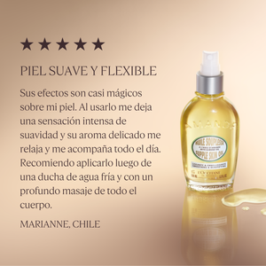 Gracias a la combinación ideal de aceite de almendra y aceite de camelina, ricos en omegas 6 y 9, este delicioso aceite corporal nutre la piel, la deja más flexible y aporta una sensación de confort. Un derivado de silicio ayuda a que la piel luzca más firme y tonificada.